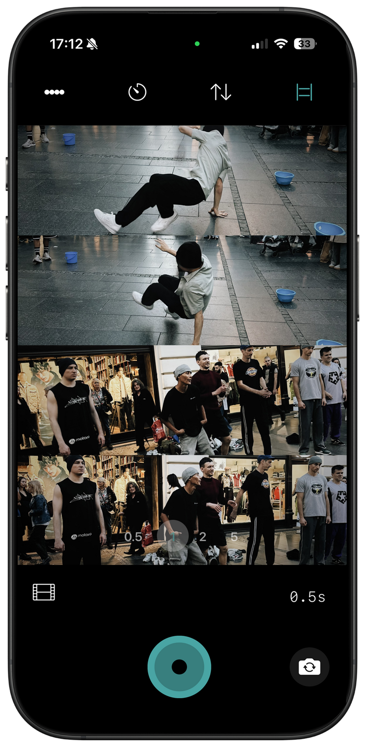 Press the capture button (you can also use volume buttons, action button, and camera control button if you have them), ssssampler takes four photos with the 0.5s interval (or 2s if you have the prrrro pack). Then it composes them into a single image with four horisontal or vertical bands, depending on your phone orientation, applies style and grain, and saves in your Photos library.Will there be a subscription?
